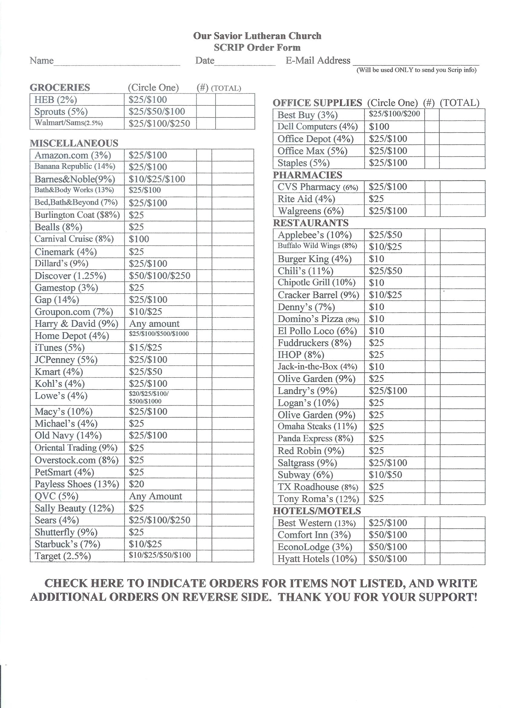 SCRIP Cards can be ordered for many vendors and your OSLC.
